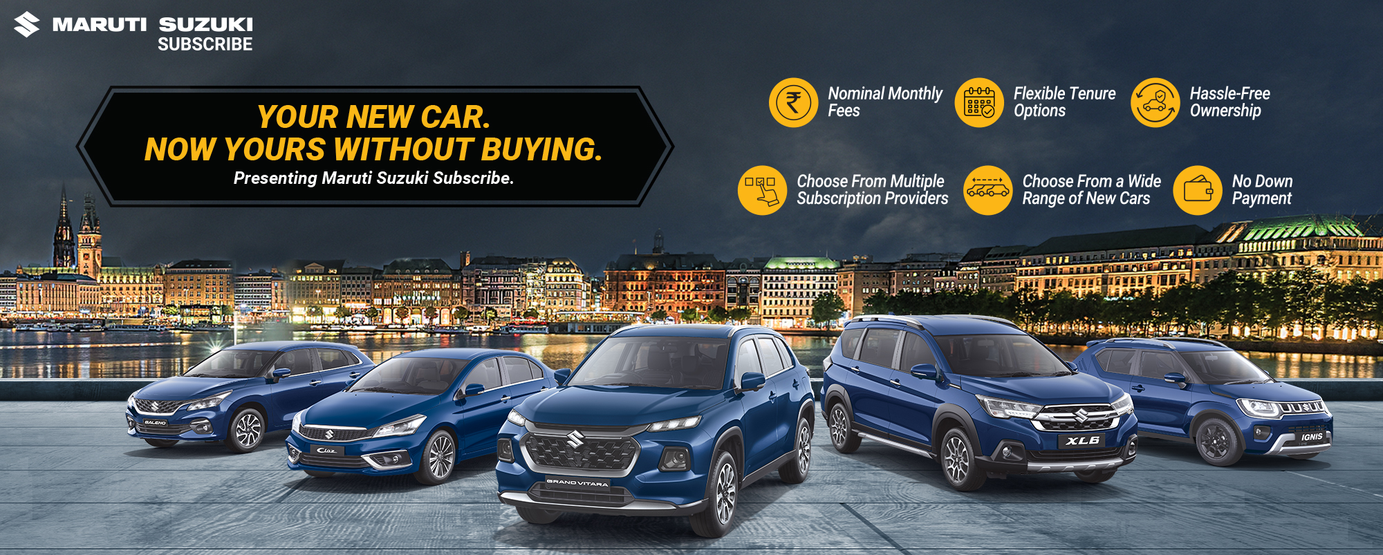 Maruti Suzuki Subscribe enables all customers to enjoy driving their preferred Maruti Suzuki cars without having to deal with all the financial responsibilities that come with owning a car.All you need to do is opt for a monthly subscription plan at a fixed monthly fee, which includes the routine maintenance and insurance costs, and choose a flexible tenure. At Kataria Automobile in, Sector 25, Gandhinagar, all Hatchback, Sedan, SUV, the MUV models line-up includes Baleno, Invicto, EVitara, Jimny, Ciaz, Ignis, Fronx, Grand Vitara, XL6. Here, you will enjoy Maruti Suzuki Subscribe benefits such as: